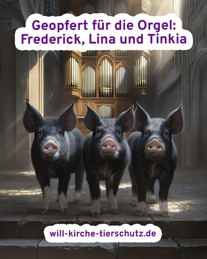 Aufkirchen / Berlin – In der evangelischen Kirchengemeinde Aufkirchen (Bayern) wurden drei Schweine – Lina, Tinkia und Frederick – für eine Kirchenorgel geopfert. Am 8. November soll nun ihr Fleisch verlost werden, um mit dem Erlös die Restauration des Instruments zu finanzieren. Die Initiative Will-Kirche-Tierschutz.de kritisiert das Vorhaben als Symbol einer erschreckenden Rückwärtsbewegung, hin zur altertümlichen Tieropferung mit neuem Anstrich.