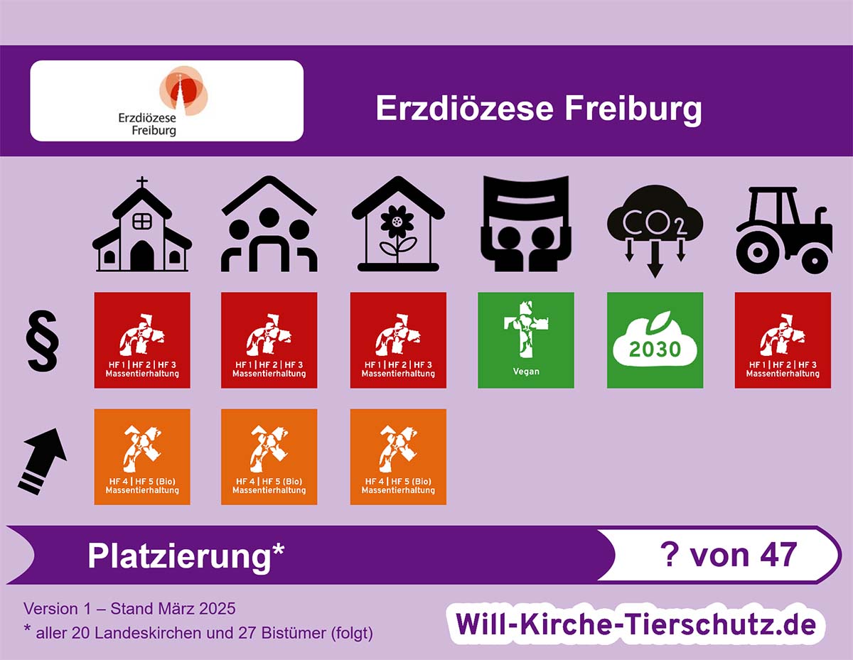Will-Kirche-Tierschutz.de fordert die Erzdiözese Freiburg auf, in ihrer ausstehenden »Ordnung zur nachhaltigen Beschaffung« zumindest Beschaffungsstandards von Tierprodukten auf dem Niveau der Haltungsformen 4 und 5 im Rahmen eines entsprechenden Zeitkorridors zu regeln. Zudem fordern wir die Erzdiözese auf, einen Tierschutzbeauftragten einzusetzen und sich öffentlich klar und wahrnehmbar für Tierschutz und eine Verringerung des Konsums von Tierprodukten sowie ein konsequentes Angebot an pflanzlichen Alternativen auszusprechen.